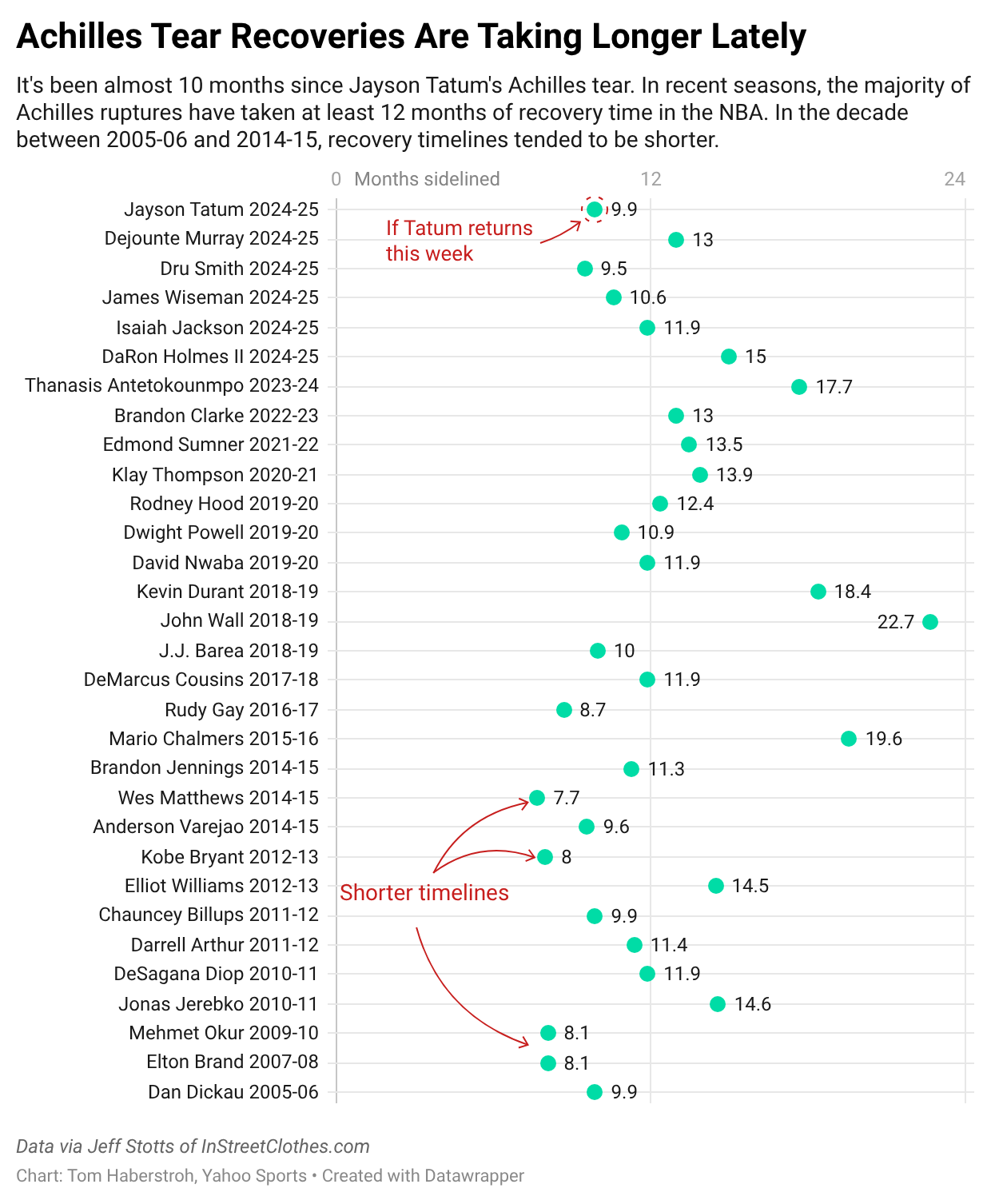 Recovery timelines don't always lend themselves to perfect apples-to-apples comparisons. Nothing about injury data is squeaky clean. A return to play could be artificially delayed because the player is waiting for the start of the season. COVID and lockout-shortened seasons could also affect an NBA player's recovery time in ways out of his control. But in general, as we await Tatum's return, it does seem that players are taking longer to get back onto the court.